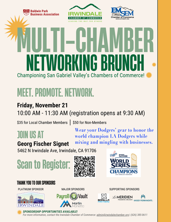 The Irwindale Chamber of Commerce invites you to our upcoming Networking Breakfast with the El Monte Chamber of Commerce and Baldwin Park Business Association on Friday, November 21 from 10:00 AM to 11:30 AM at the Georg Fischer building on 5462 N Irwindale Ave, Irwindale, CA 91706.