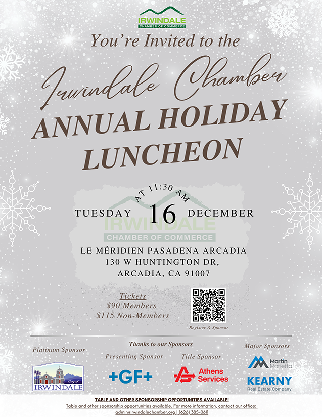 The Irwindale Chamber of Commerce invites you to our upcoming Holiday Luncheon & Milestone Members Recognition on Tuesday, December 16 from 11:30 AM to 1:30 PM at Le Meridien Hotel on 130 W Huntington Dr, Arcadia, CA 91007. Singing, eating, and door prize drawings with Santa.