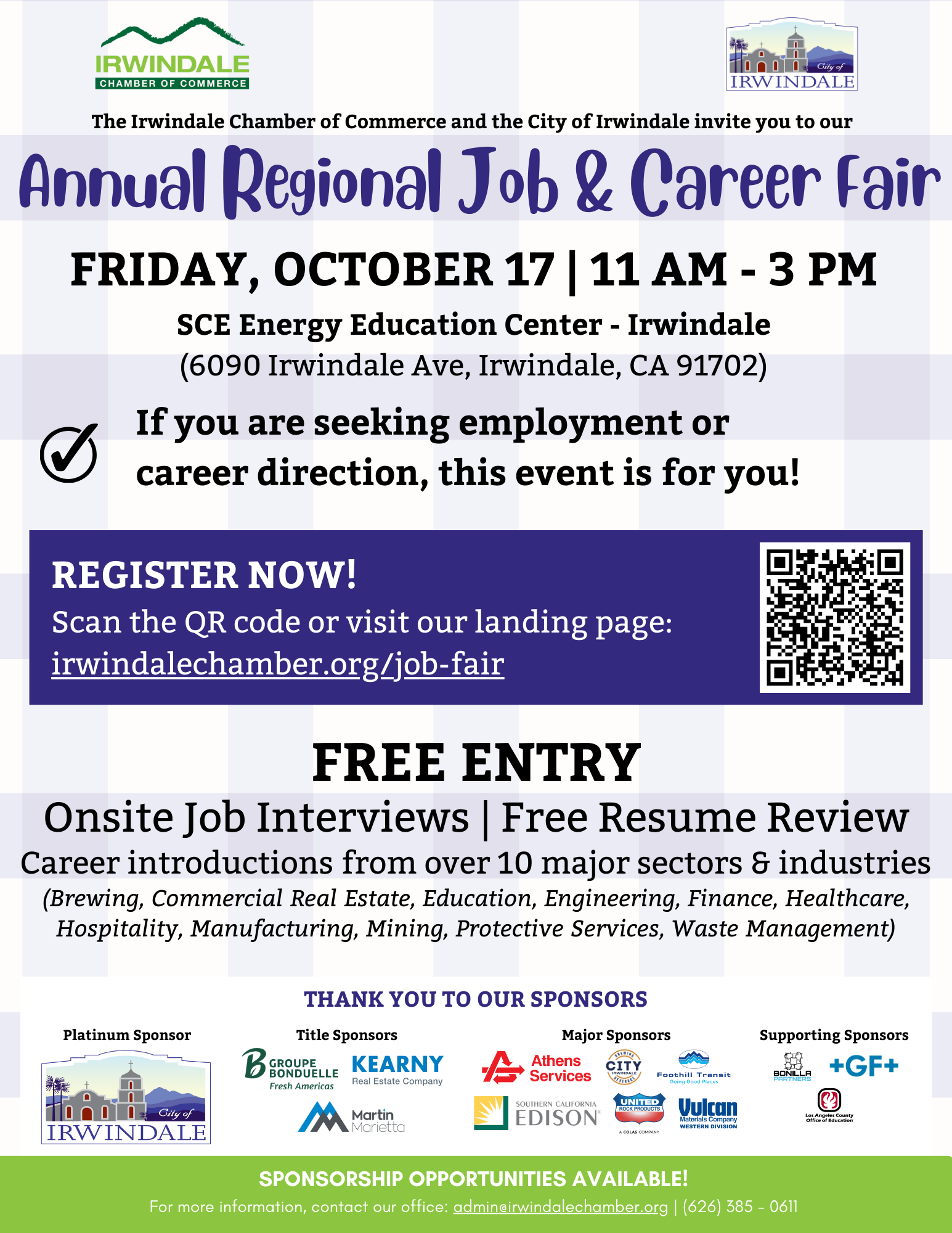 admin@irwindalechamber.org or by calling (626) 385 - 0611.