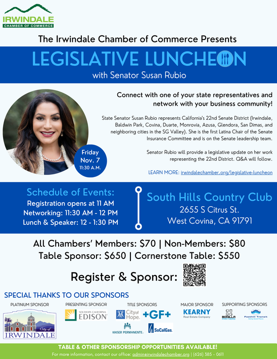 The Irwindale Chamber of Commerce invites you to our Legislative Luncheon with Senator Susan Rubio on Friday, November 7 from 11:30 AM to 1:30 PM at South Hills Country Club (2655 S Citrus St, West Covina, CA 91791).